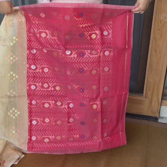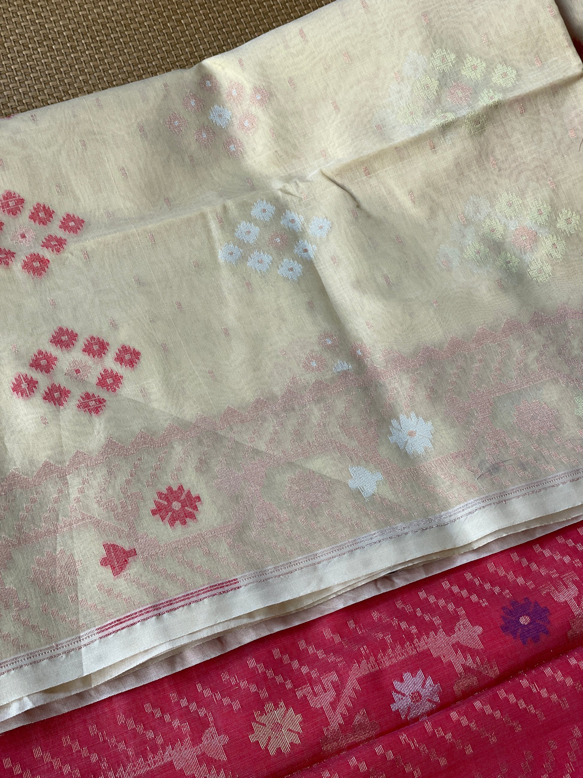 An expression of understated luxury, this handwoven cotton silk saree blends breathable comfort with a soft, elegant sheen. Finely woven zari bootis lend a delicate shimmer, making it a timeless choice for elevated everyday wear and graceful daytime occasions.