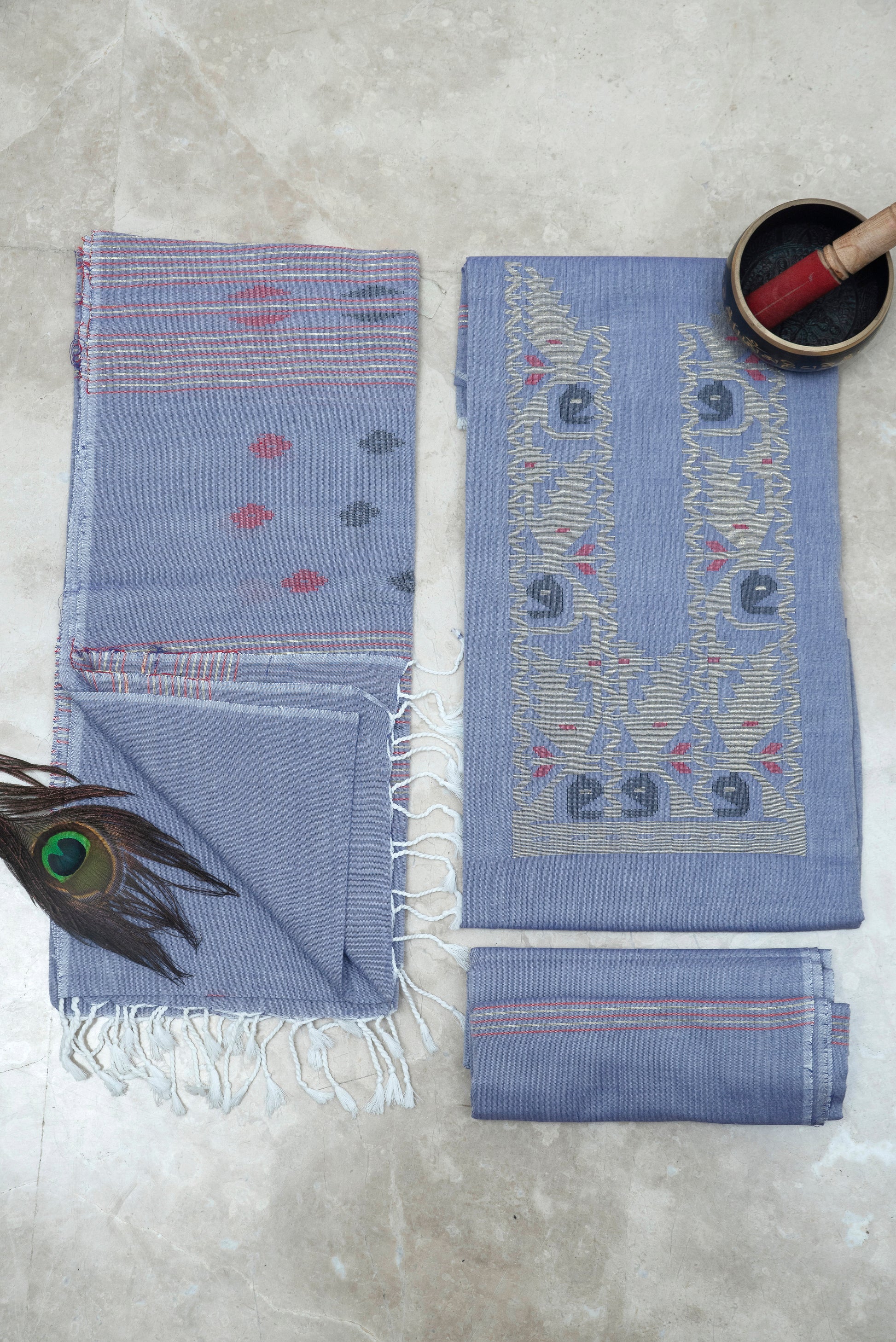 Crafted on the loom in fine cotton, this Jamdani suit features intricate motifs touched with zari for a subtle yet luxurious glow. A blend of tradition and sophistication, it drapes with quiet grandeur—perfect for festive gatherings and timeless wardrobes.