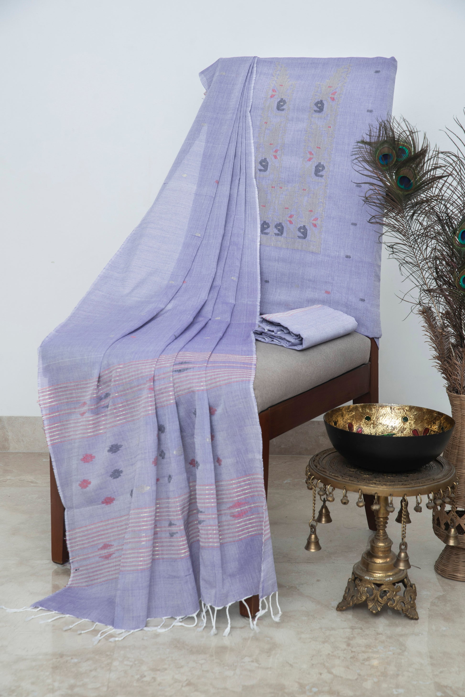 Lavender Hand Woven Mul Jamdani Suit With Zari