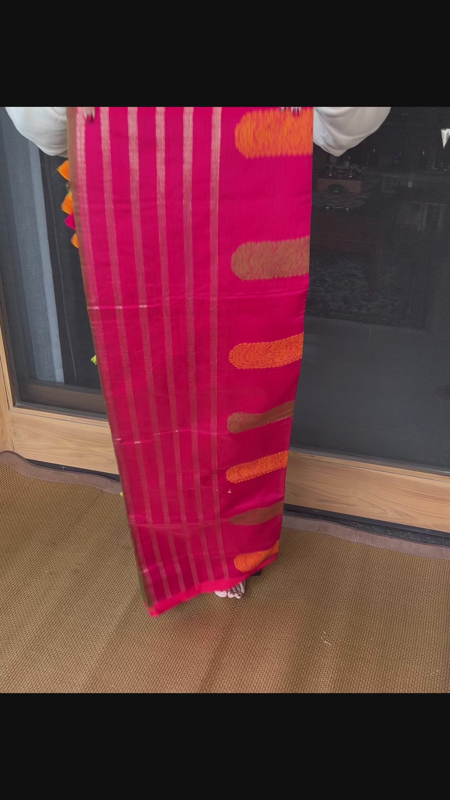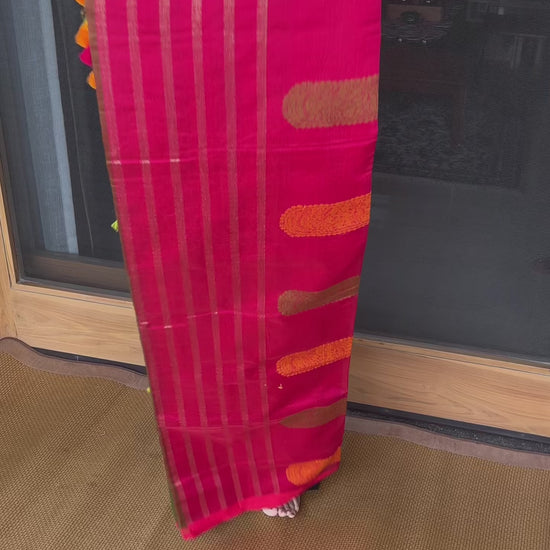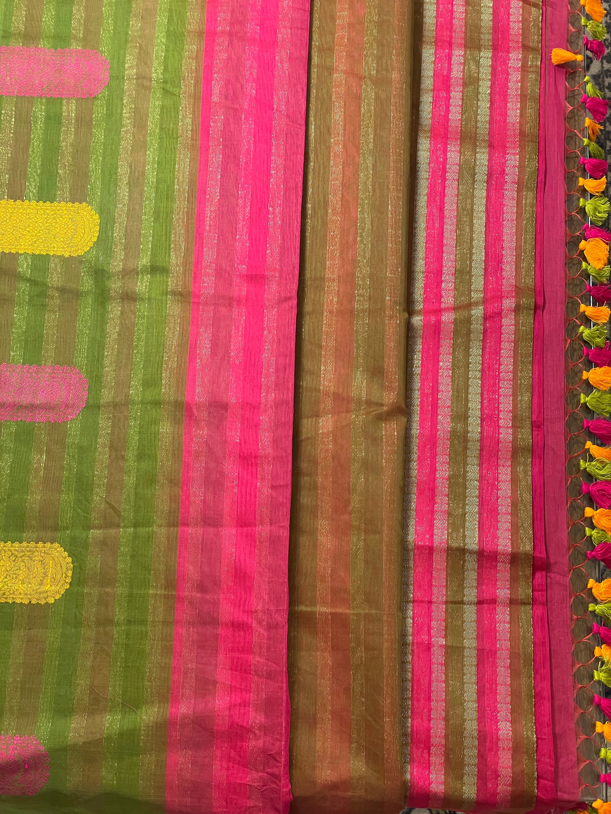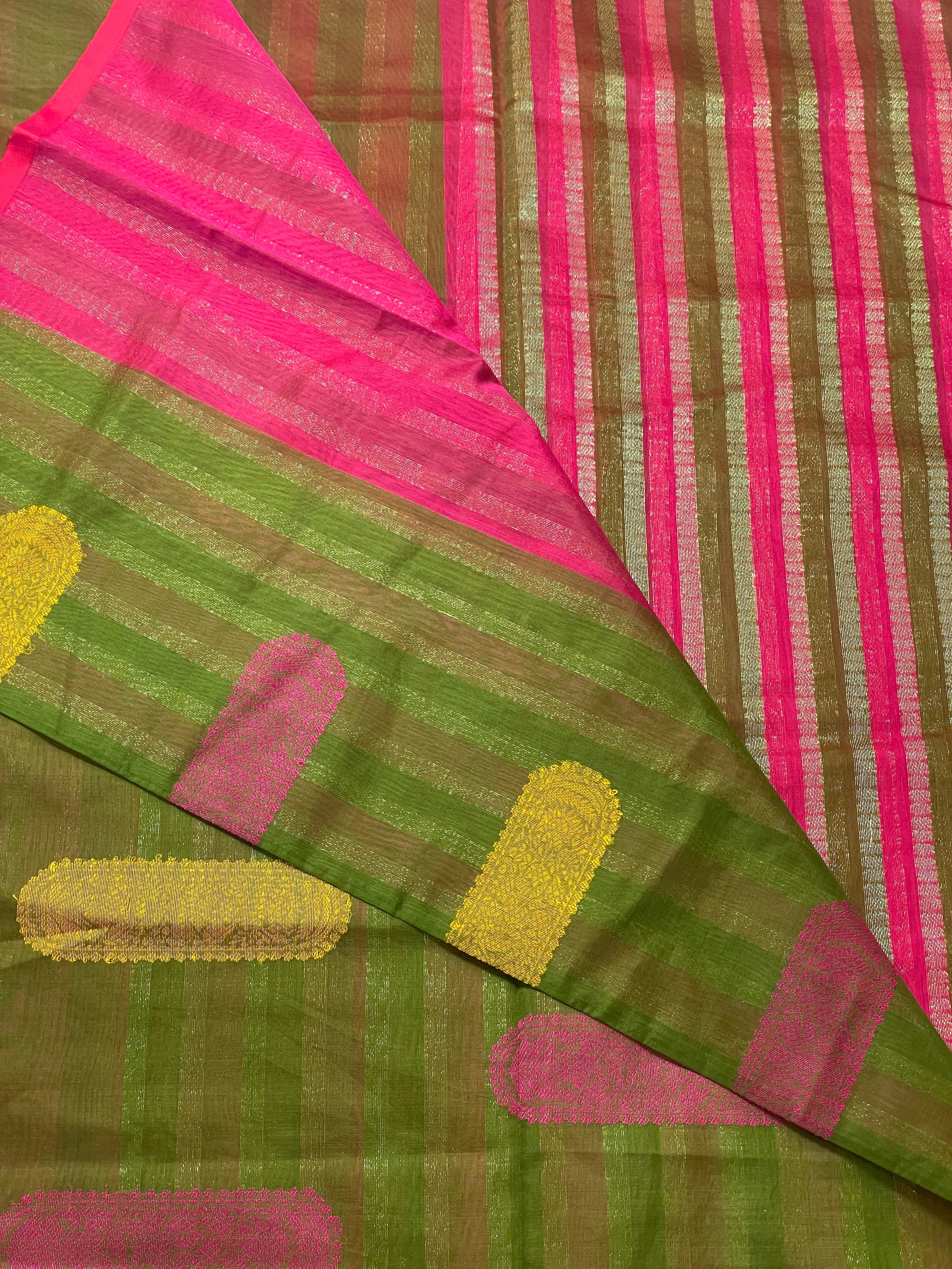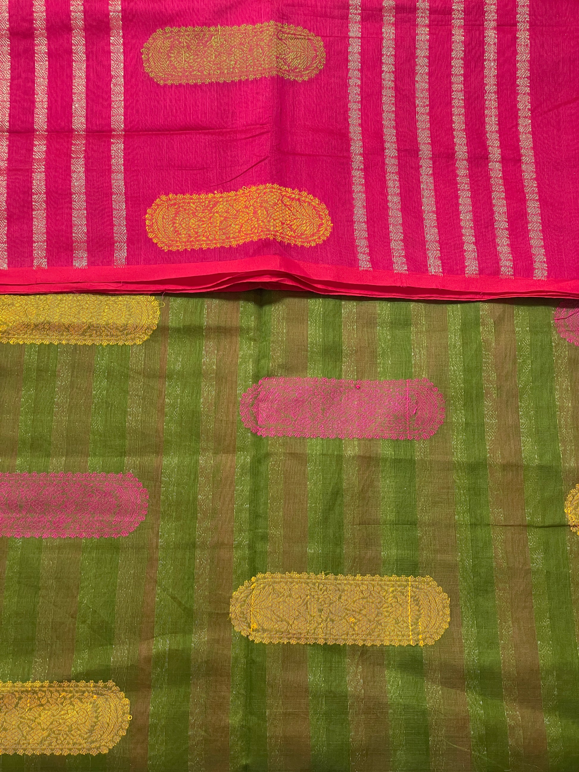 Magenta Green Yellow Bengal Mercerised Cotton Saree